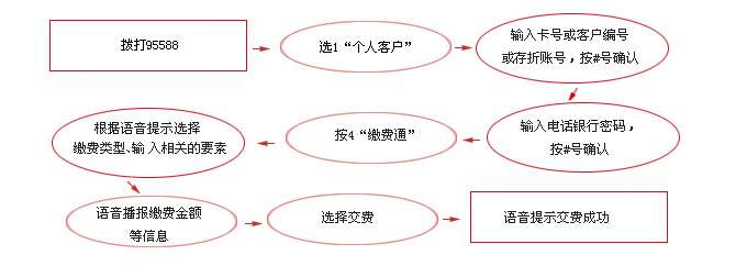 6、工商银行各省市提供的电话银行缴费功能不尽相同,客户如需使用此功能请拨打当地工行客户服务热线电话95588进行咨询。